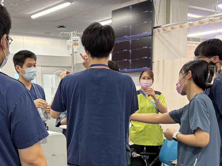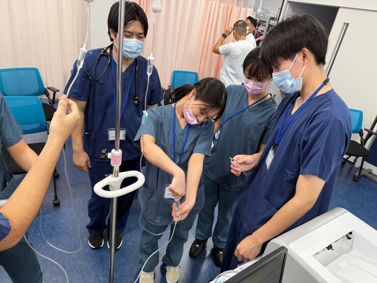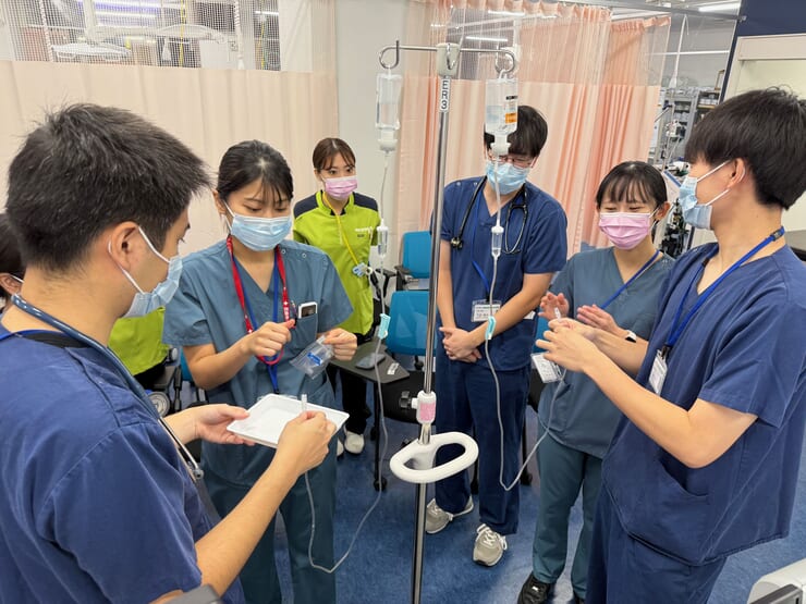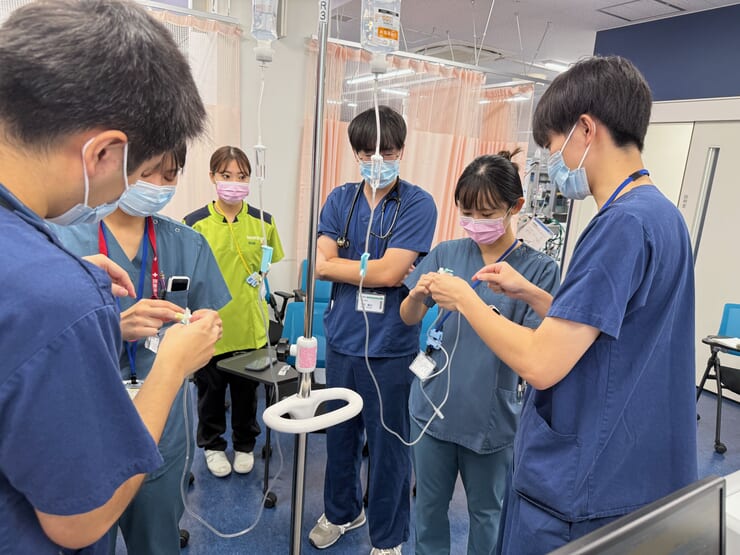 三方活栓から安全に薬液を投与する方法を、看護師さんに確認してもらいながらやってもらうと