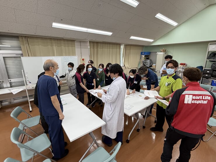 そして、トリアージタグを患者さん、机を診療エリアのベッドに見立てて訓練が開始。