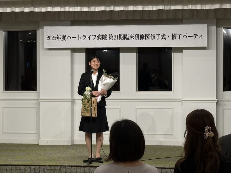 たすきがけ研修でハートライフ病院で1年間初期研修をしてくれたSきま先生にも同期の先生たちから花束が