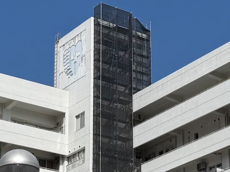新年度、ハートライフ病院の外観に黒いネットがかかっています。